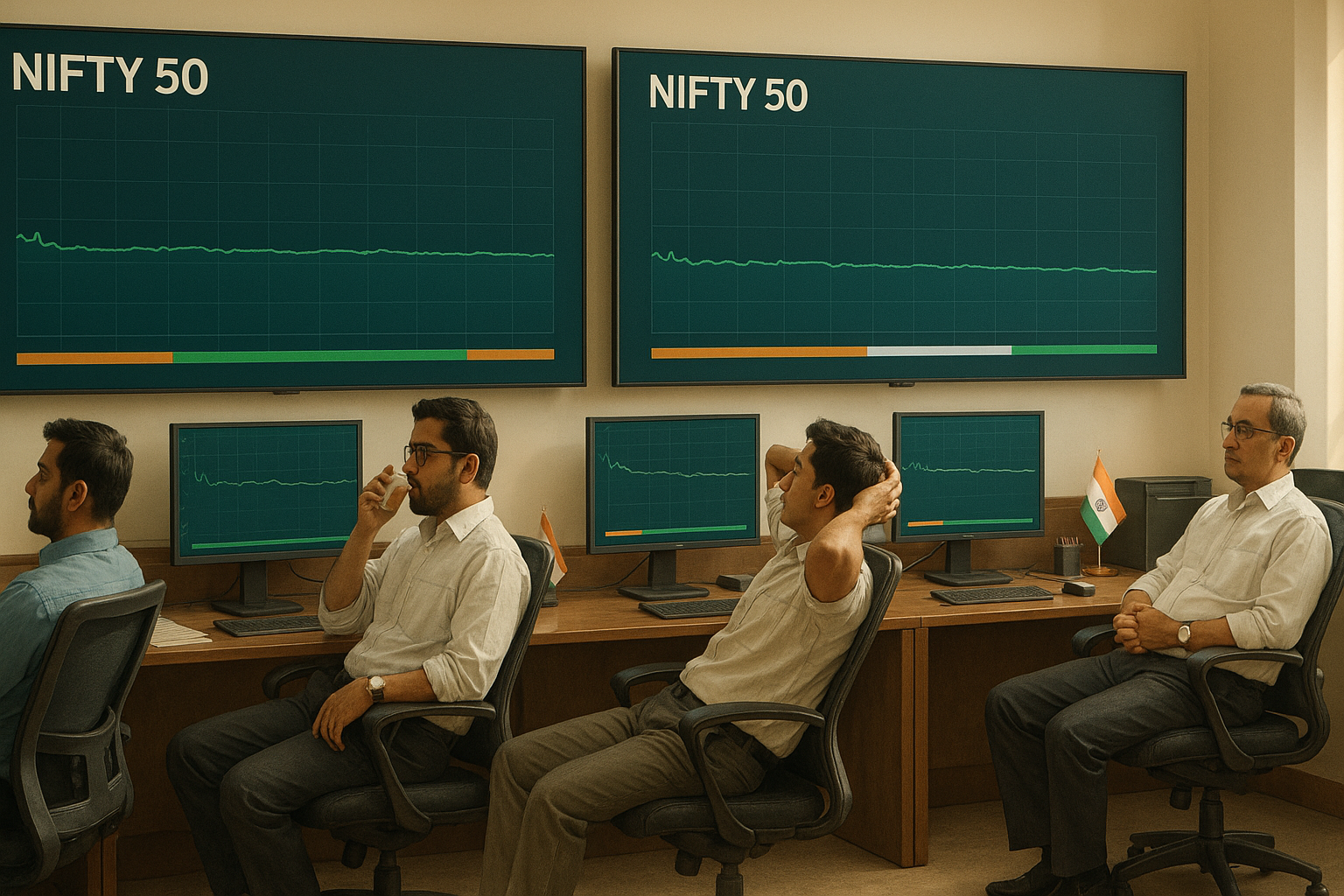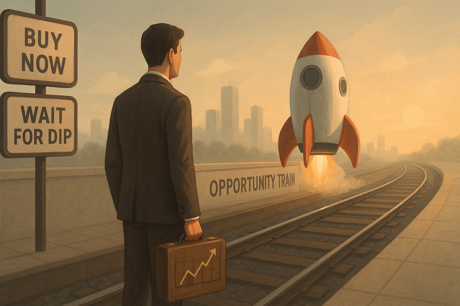 Create a 16:9 landscape, photorealistic scene: in the foreground, a polished business‐shoe–clad foot hesitates between a glowing red brake pedal and a glowing green accelerator pedal mounted on a wooden dashboard. In the softly blurred background sta
