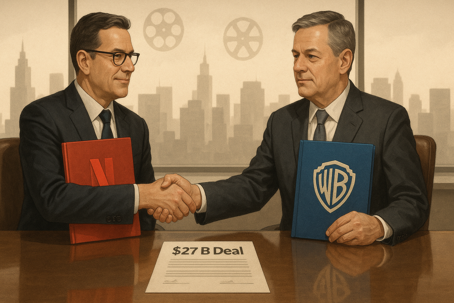 Create a realistic, landscape-oriented (16:9) corporate-style illustration of a high-stakes poker game in a sleek boardroom. In the center, a green-felt poker table holds a single massive stack of chips labeled “$40 B” with the SoftBank logo, facing